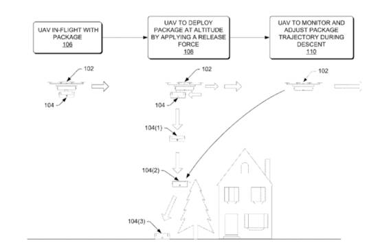 在这项专利文件中,亚马逊描述道:包裹将能直接在半空中从无人机投下,并会配合实际地形和环境,通过利用降落伞、压缩空气等不同方式来确保包裹能落到理想地点。现在无人机快递现在主要服务的地点都是在偏远、难以到达的地方,所以地面状况也难以预料。亚马逊申请的这个专利功能,就能解决万一无人机无法找到合适地点降落时的困境,直接投下包裹就能离开。
