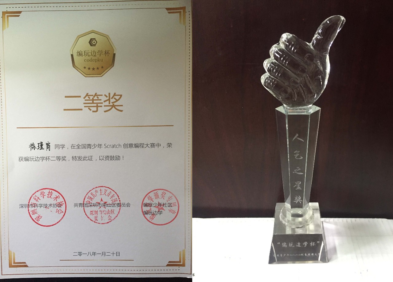 “在网上看到12月份编玩边学的编程大赛,我就鼓励他和机器人班上的几个小伙伴一起去参加。当时用的就是这款‘猎魔之战’,获得了二等奖和人气之星奖。”