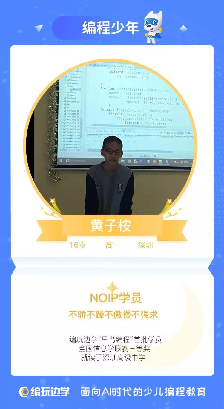 从完全不知道编程为何物,到现在的联赛三等奖,黄子桉同编玩边学一同成长。