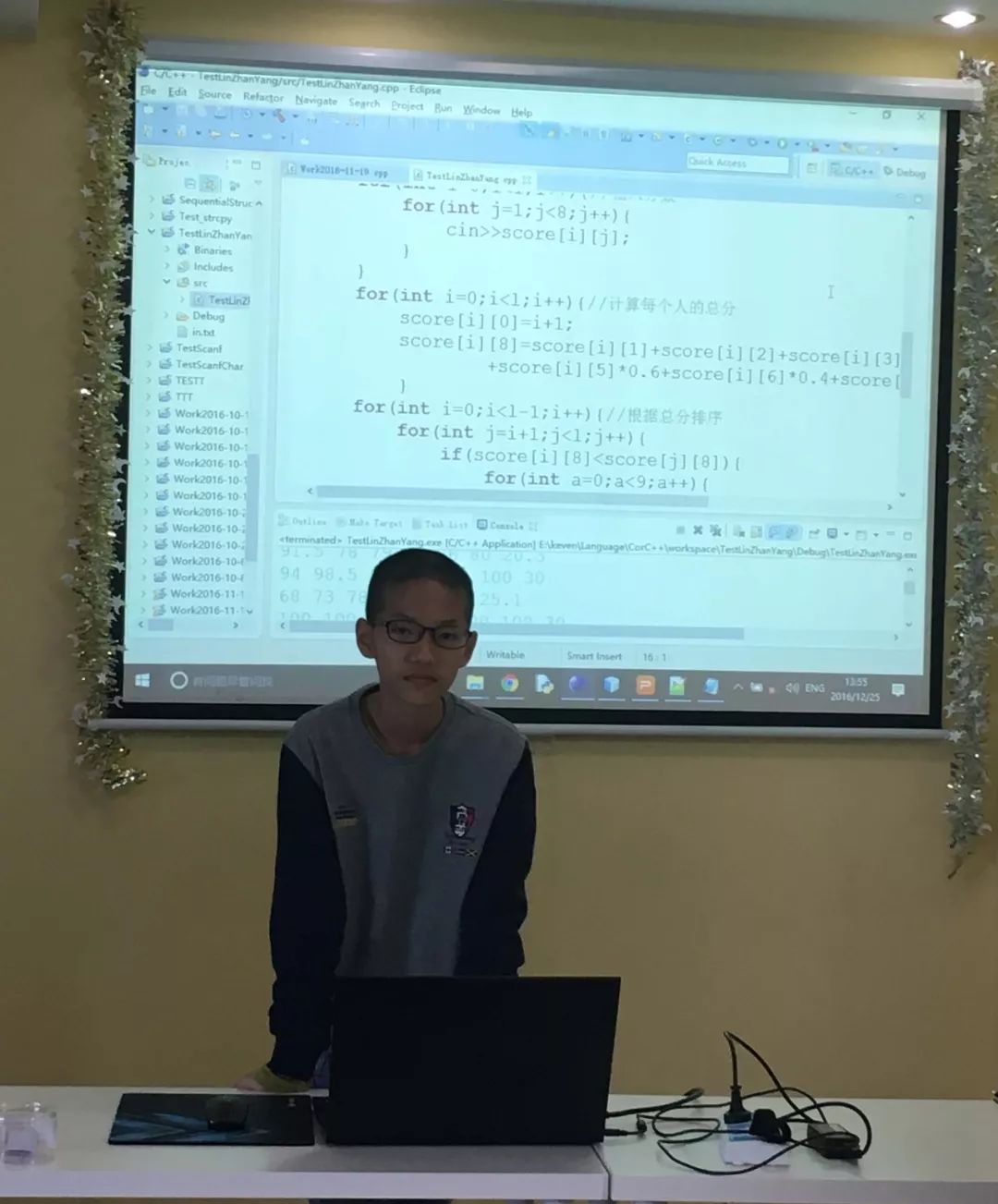 黄子桉在演示用C++编写的中考成绩统计程序