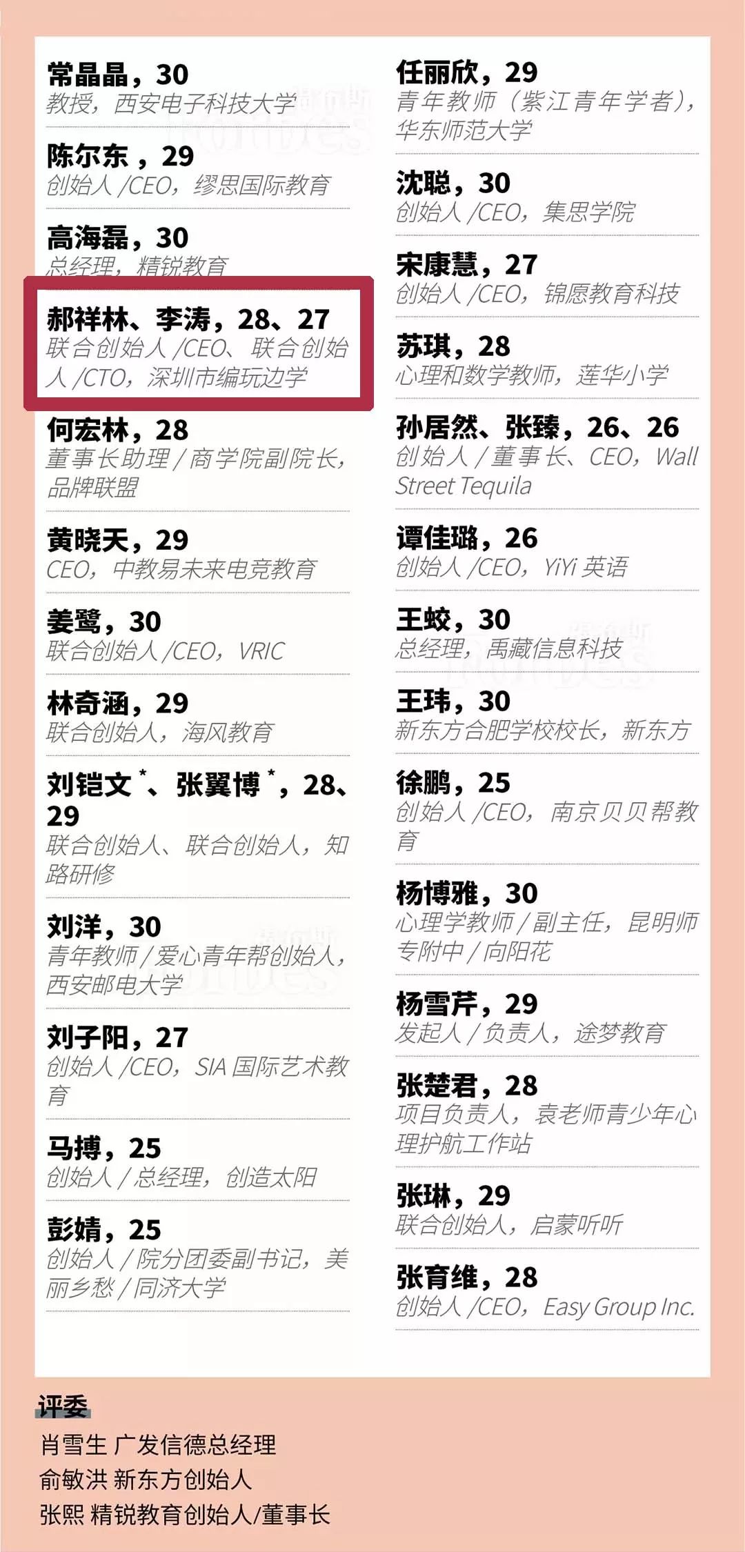 其中,出生于90年的、深圳市编玩边学教育科技有限公司的创始人兼CEO郝祥林和出生于91年的、编玩边学联合创始人兼CTO李涛成为“教育领域”的上榜精英。