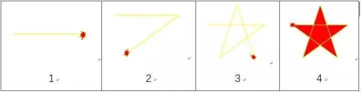 1. 画一条直线,再旋转一个角度画第二条直线,循环5次,再填充颜色。5条直线长度一致,旋转角度一致。通过三角形内角和180度推算出旋转角度为144度。