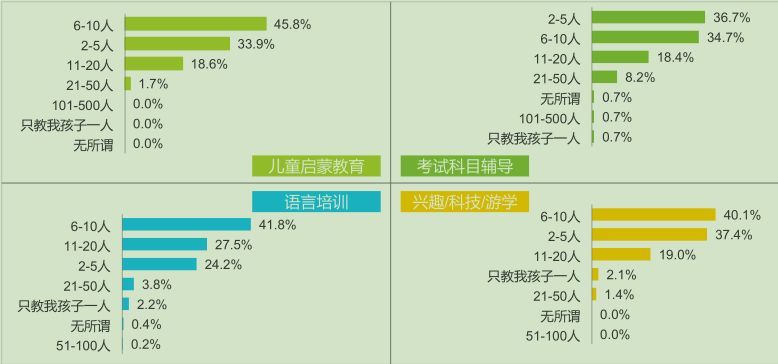 腾讯大数据的调查报告也表明6人小班的受欢迎程度,下图是全国家长对培训班型偏好的调查:6-10人小班排名第一。