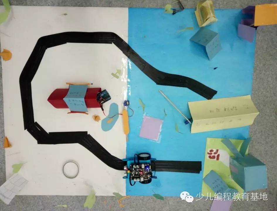 最后,上帝组成功地用编程把模型小车运作起来,顺利地走完了设计的路线~